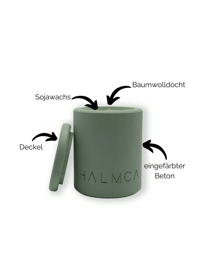 Unsere Kerze hat einen Deckel aus Beton, der als Untersetzer oder Verschluss verwendet werden kann. Vegan, Sojawachs-Mischung, ca. 40 Stunden Brenndauer.